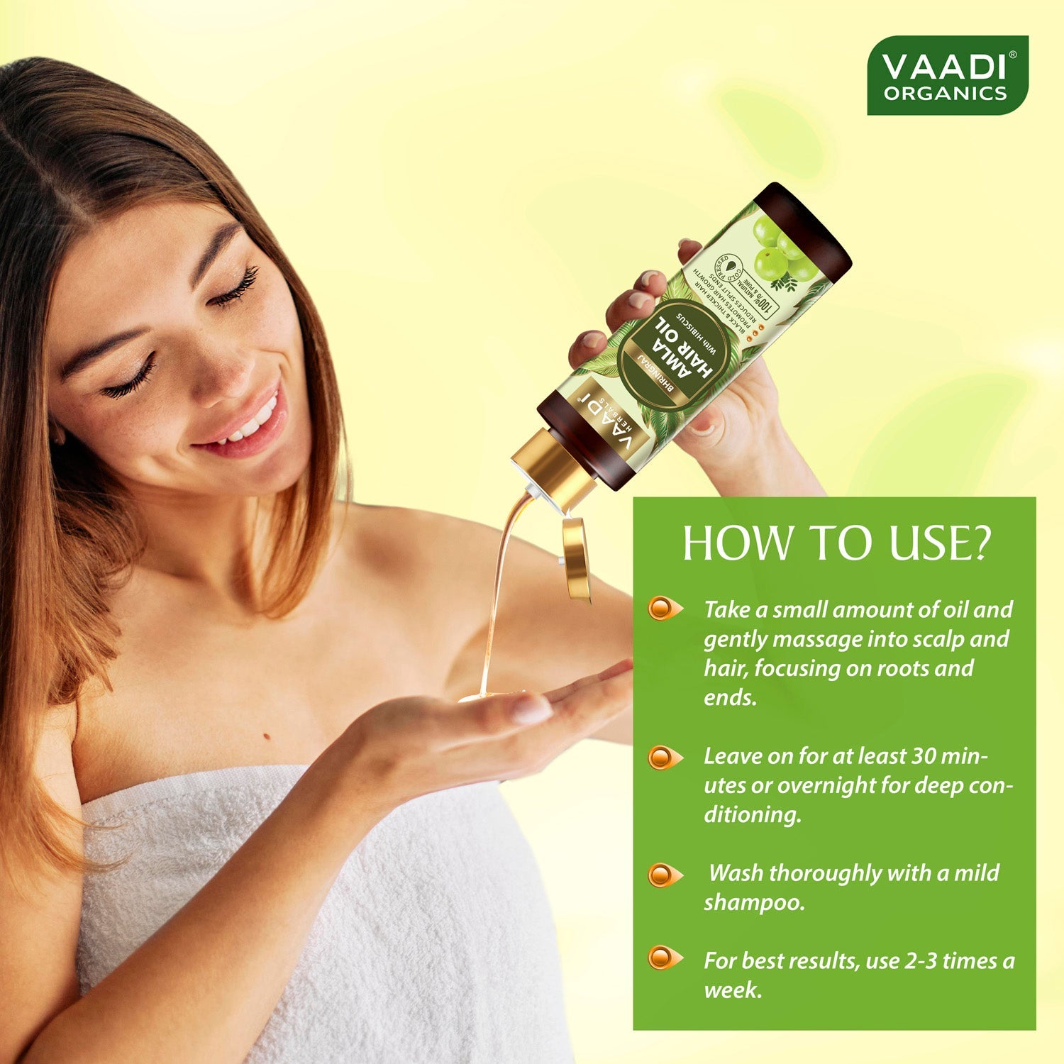 Take a small amount of oil and gently massage into scalp and hair, focusing on roots and ends. Leave on for at least 30 minutes or overnight for deep conditioning. Wash thoroughly with a mild shampoo. For best results, use 2-3 times a week