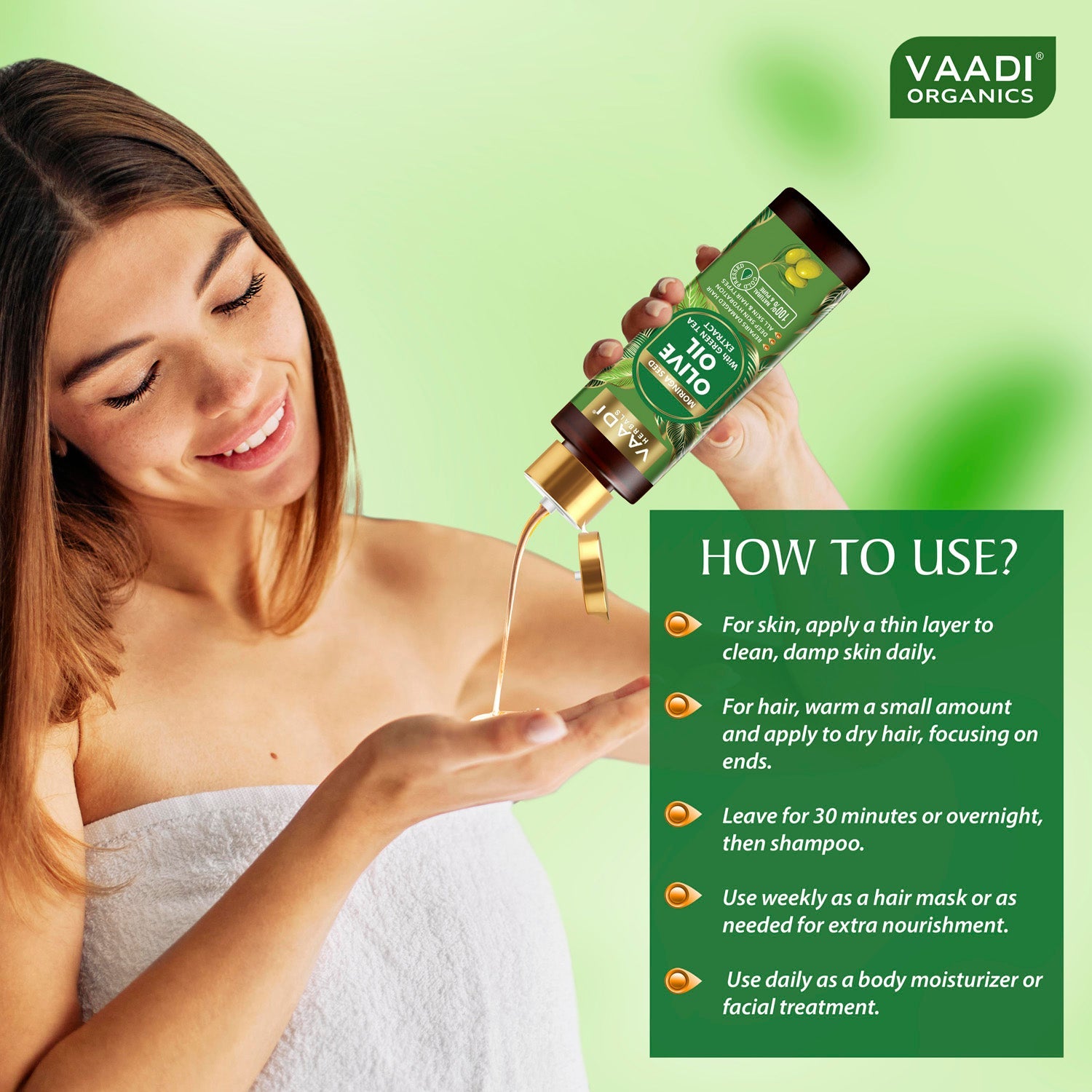 For skin, apply a thin layer to clean, damp skin daily. For hair, warm a small amount and apply to dry hair, focusing on ends. Leave for 30 minutes or overnight, then shampoo. Use weekly as a hair mask or as needed for extra nourishment. Use daily as a body moisturizer or facial treatment