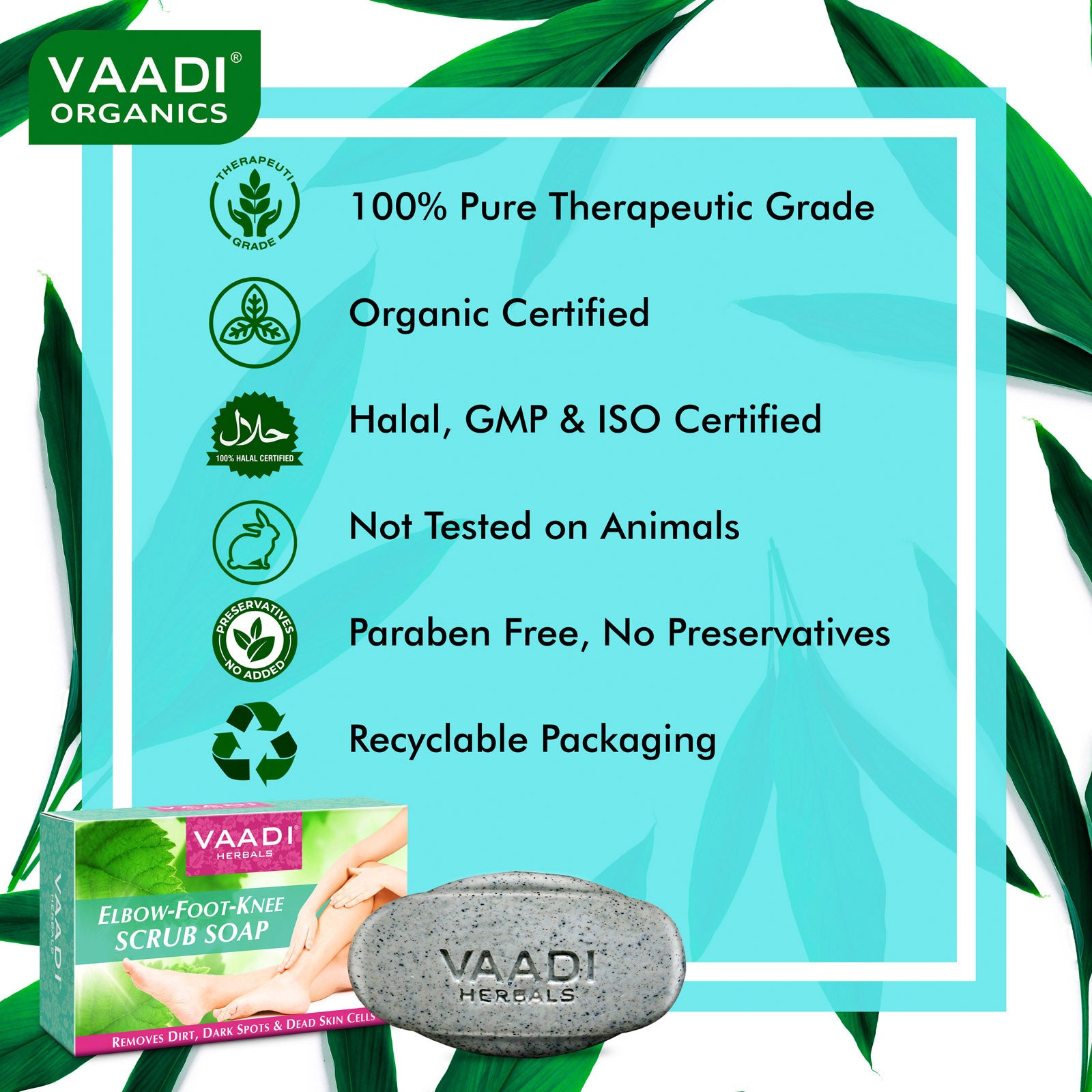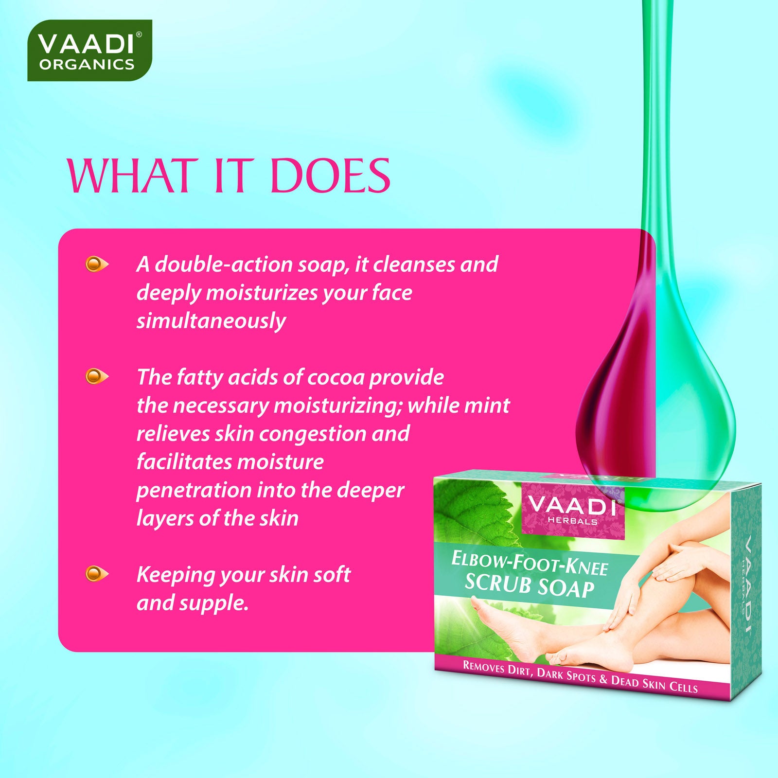 A good pedicure treatment in a salon is expensive. However, it cannot be neglected as the feet need pampering and scrubbing as they are always on ground and trap dirt, get tanned in sun and are the most neglected. With Vaadi's Elbow-Foot-Knee Scrub Soap, pedicure is not such a task anymore. All one needs is a warm water and scrub soap to exfoliate the feet and also sensitive areas like elbows and knees. After a regular usage of this soap, a visible difference is seen as the skin is few tones lighter and even tanning can be reduced through this easy treatment at home. Regular exfoliation with the scrub soap will not let dead skin accumulate hence diffusing chances of boils, infections, pigmentation or skin darkening. An easy home pedicure is all it takes to beautify the appearance of feet. Also, elbows and knees too get the necessary attention and care.