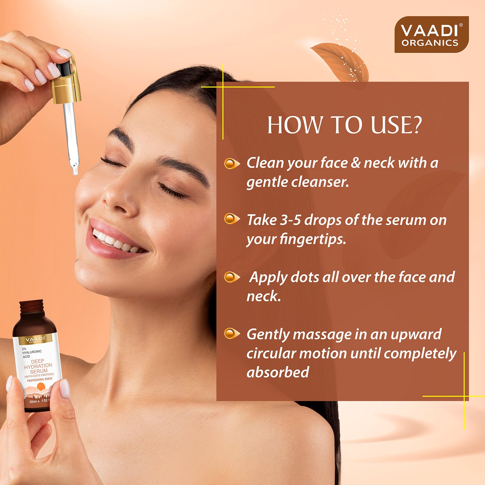 Clean your face & neck with a gentle cleanser. Take 3-5 drops of the serum on your fingertips. Apply dots all over the face and neck. Gently massage in an upward circular motion until completely absorbed. Follow it up with an Oil-Free Face Moisturizer. For best results use twice daily (AM PM).