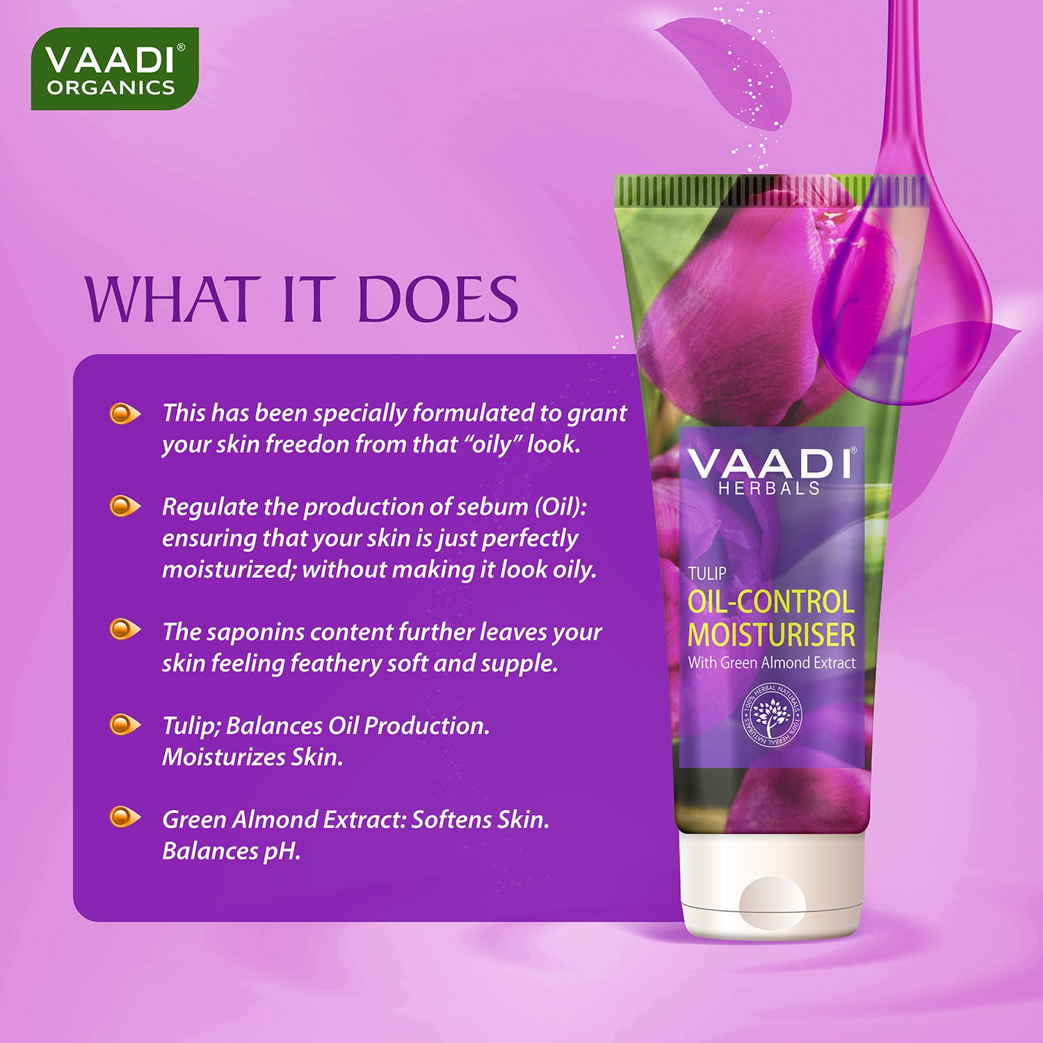 This has been specially formulated to grant your skin freedom from that “oily” look. Both, Tulip and Green Almond Extract, regulate the production of sebum (oil); ensuring that your skin is just perfectly moisturized; without making it look oily. The Saponins content further leaves your skin feeling feathery soft and supple.