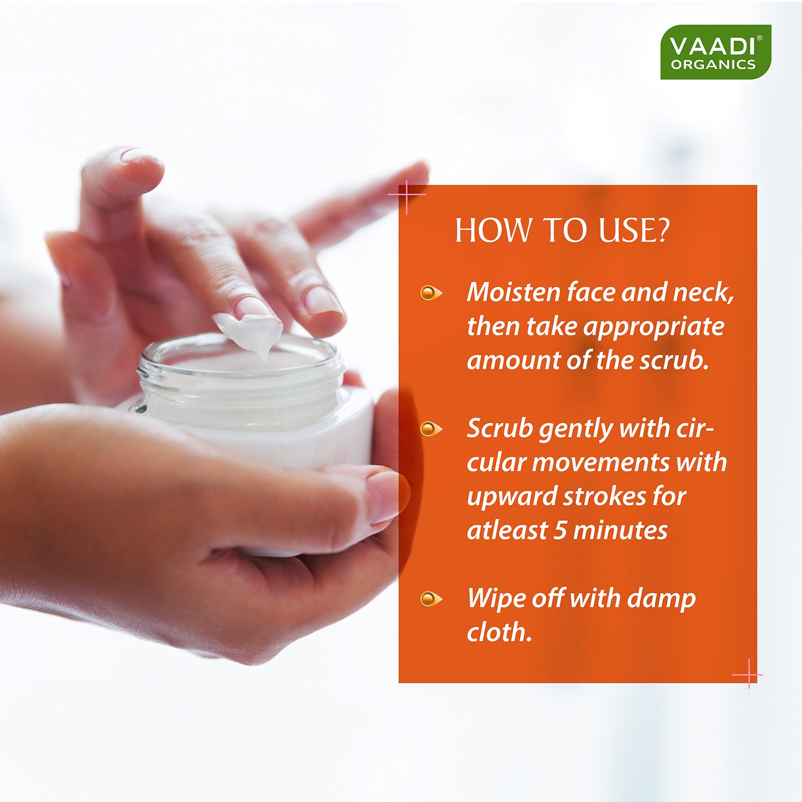Moisten Face And Neck, Then Take Appropriate Amount Of The Scrub. Scrub Gently With Circular Movements With Upward Strokes For Atleast 5 Minutes. Wipe Off With Damp Cloth.