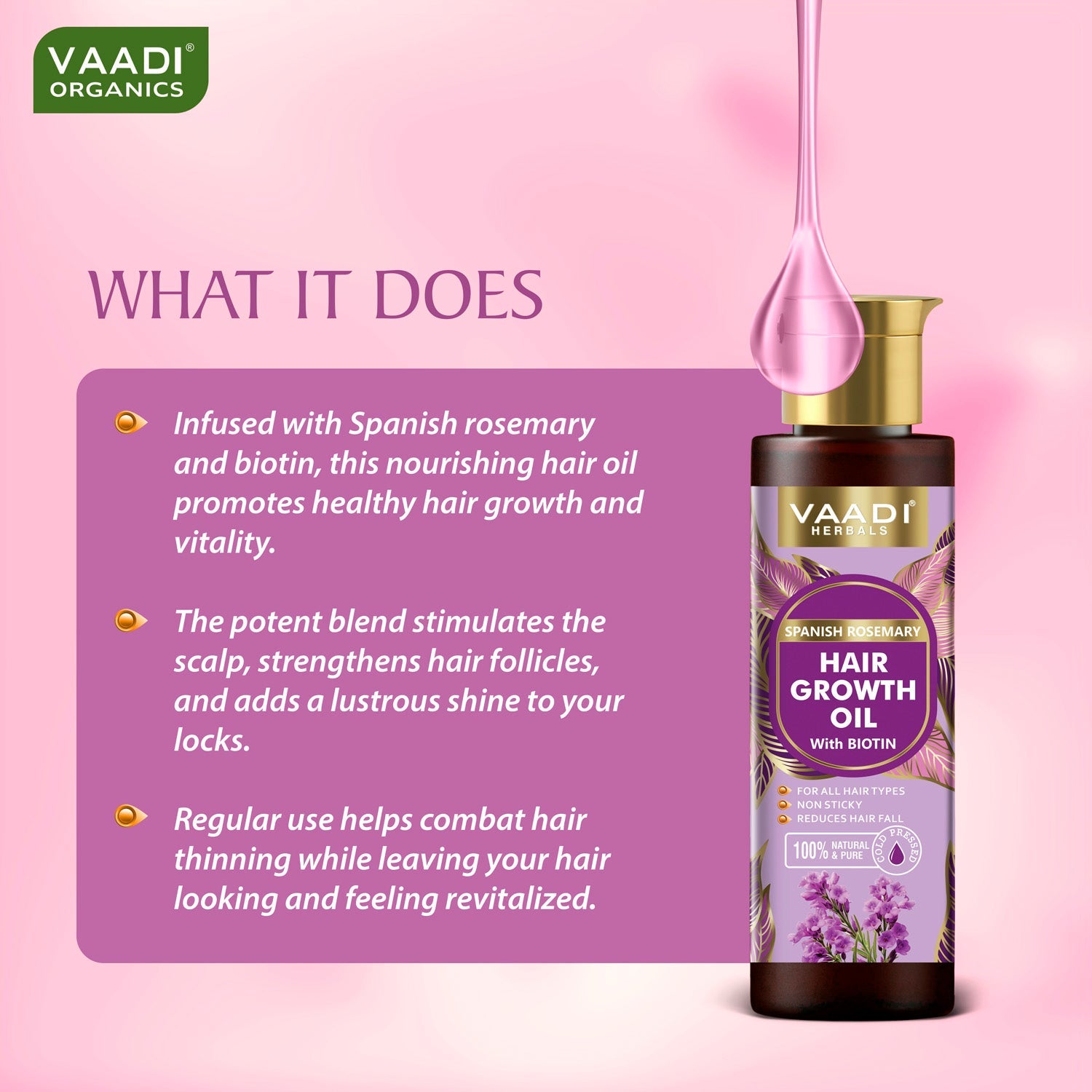 Experience the transformative power of our Hair Growth Oil, a revolutionary blend enriched with Spanish Rosemary extract and Biotin that provides essential nourishment to combat all hair and scalp concerns. This nutrient-rich formula delivers intensive care to weak, thinning hair and troubled scalps, revitalizing both texture and overall hair health. Our powerful blend combines premium ingredients processed to maintain their nutritional integrity, ensuring maximum benefits and making hair up to 2X stronger and more resistant to hair fall. The fast-absorbing, non-sticky formula gets quickly absorbed into the scalp, while regular head massage helps boost blood circulation, promoting optimal hair growth conditions. This versatile, hexane-free, non-greasy oil works perfectly for all hair types, from straight to very curly, and can be used as both a pre-shampoo treatment and post-wash serum to combat hair fall, tame frizz, repair damaged strands, and enhance texture and shine. See visible results in 6-8 weeks with consistent use of our 100% natural, carefully selected ingredients known to promote healthy hair growth and reduce hair fall, making it the perfect solution for those seeking to transform their hair naturally.