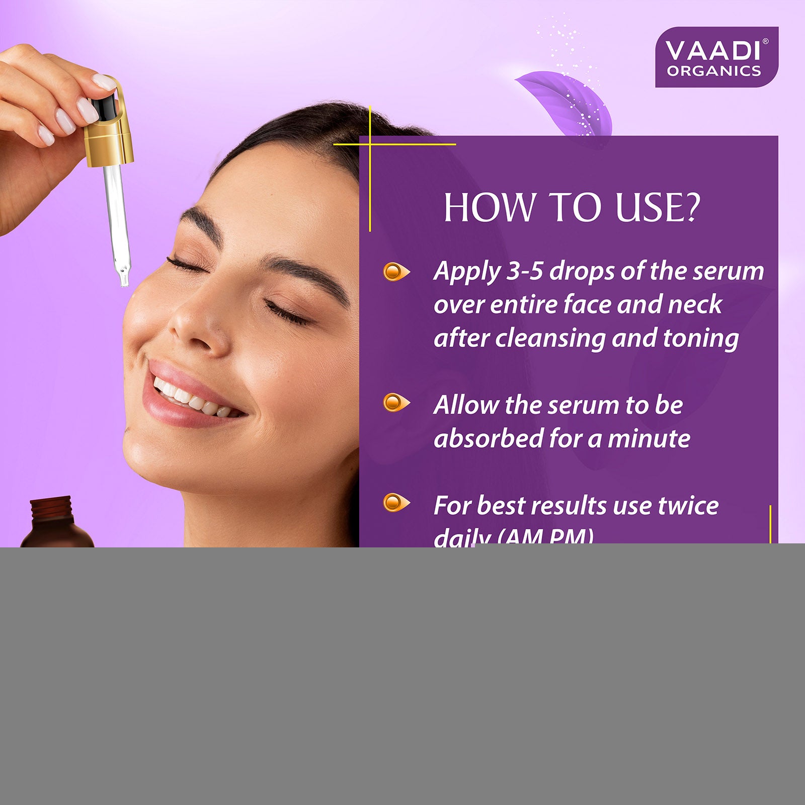 Apply 3-5 drops of the serum over entire face and neck after cleansing and toning. Allow the serum to be absorbed for a minute. Follow with an oil free moisturizer. For best results use twice daily (AM PM).