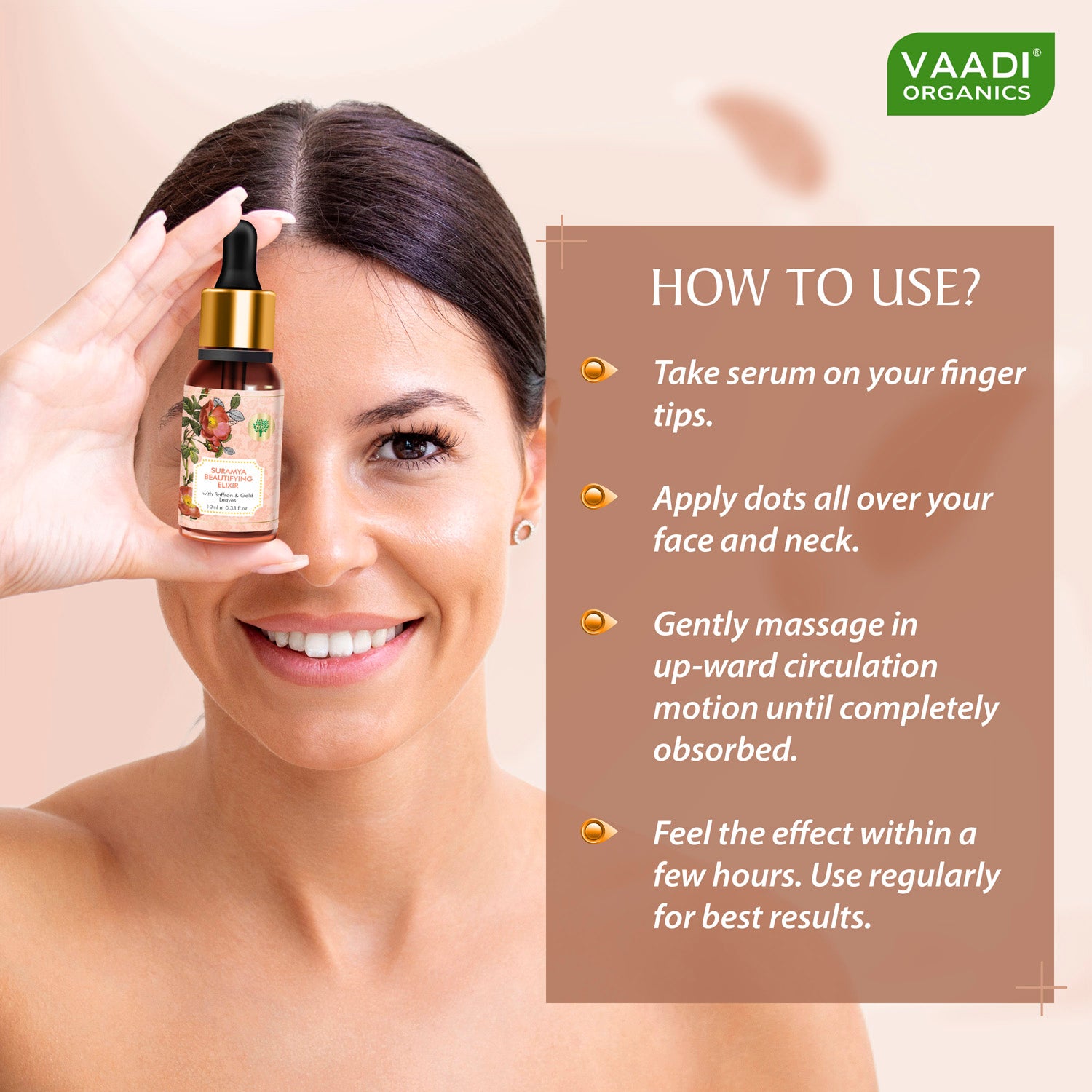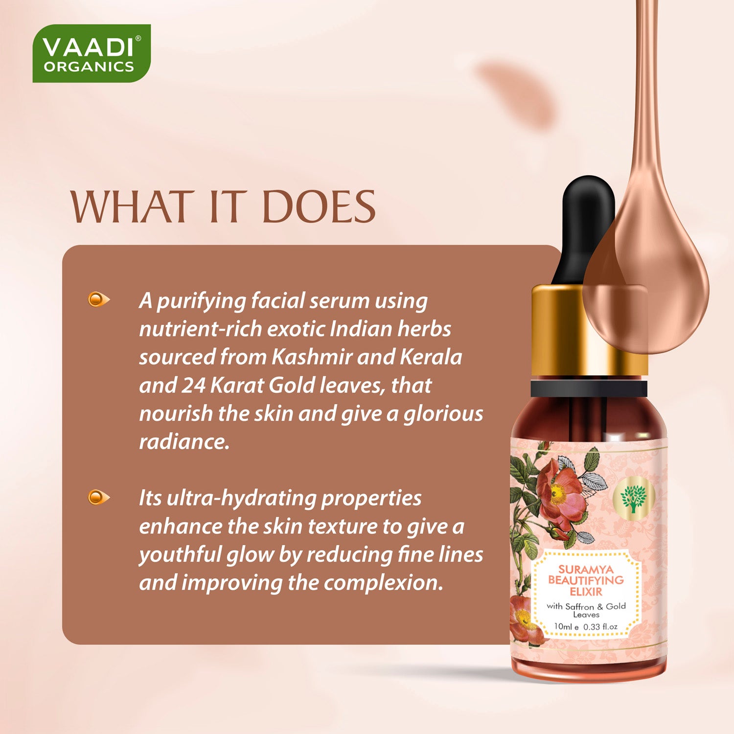 Suramya Beautifying Elixr (Pure Mix of Saffron, 24k Gold Leaves & Sweet Almond Oil) - Reduces Fine Lines, Improves Skin Complexion & Gives a Natural Glow (10 ml/ 0.33 oz)